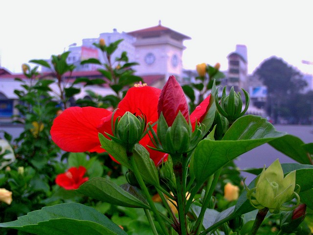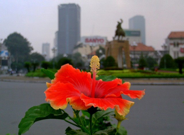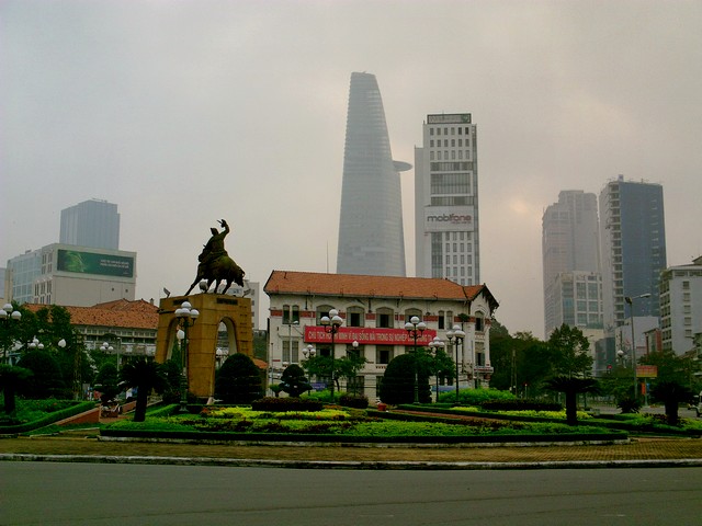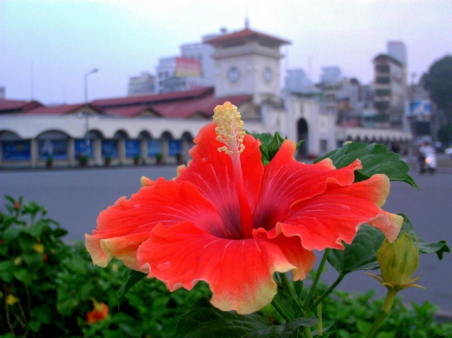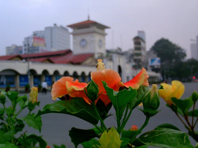 Vào lúc 6 giờ sáng, chợ Bến Thành chưa mở cửa, đường c̣n vắng xe và chưa đông người...